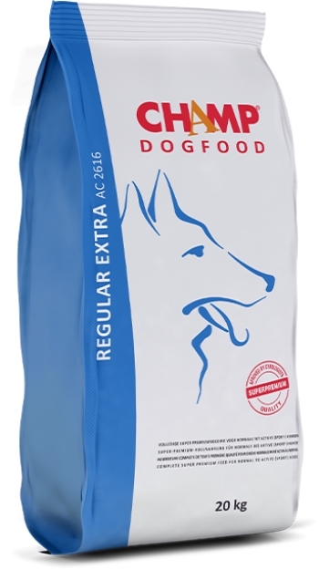 Η υψηλής διατροφικής αξίας και ισορροπημένη Champ Regular Extra, είναι ιδιαίτερα κατάλληλη για δραστήριους σκύλους. Σχεδιάστηκε με βάση τα πουλερικά, για σκύλους εργασίας ή σκύλους που βρίσκονται σε καταστάσεις καταπόνησης. Η Regular Extra είναι επίσης ιδανική για σκύλους που αναπτύσσονται και σκύλους που από την φύση τους δεν απορροφούν αρκετή τροφή. Το χαρούπι υψηλής περιεκτικότητας σε φυτικές ίνες βοηθά στη διατήρηση των κοπράνων στερεών υπό οποιεσδήποτε συνθήκες. Δίνει επίσης στον σκύλο σας ένα λαμπερό τρίχωμα. Επειδή ολα τα θρεπτικά συστατικά υπάρχουν στις σωστές αναλογίες, η Regular Extra είναι η ειδική τροφή για τους πιο δραστήριους (αθλητικούς) σκύλους. Τα Ωμέγα-6 και Ωμέγα-3 λιπαρά οξέα, υπάρχουν στη βέλτιστη αναλογία 5:1. Η λεκιθίνη βελτιώνει την πέψη των λιπών και δίνει στο σκύλο σας ένα όμορφο, γυαλιστερό τρίχωμα. Η Champ Regular Extra θα βοηθήσει το σκύλο σας να ανακτήσει γρήγορα δυνάμεις μετά από έντονη δραστηριότητα.